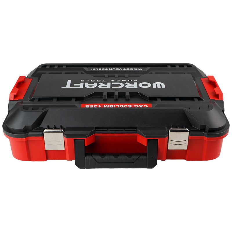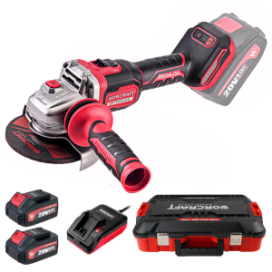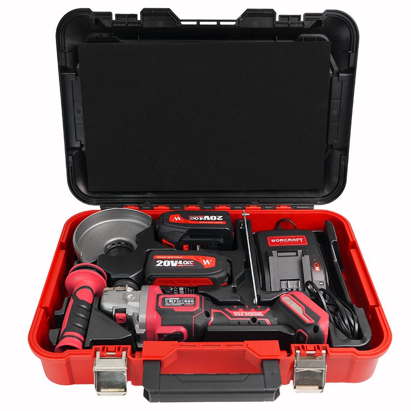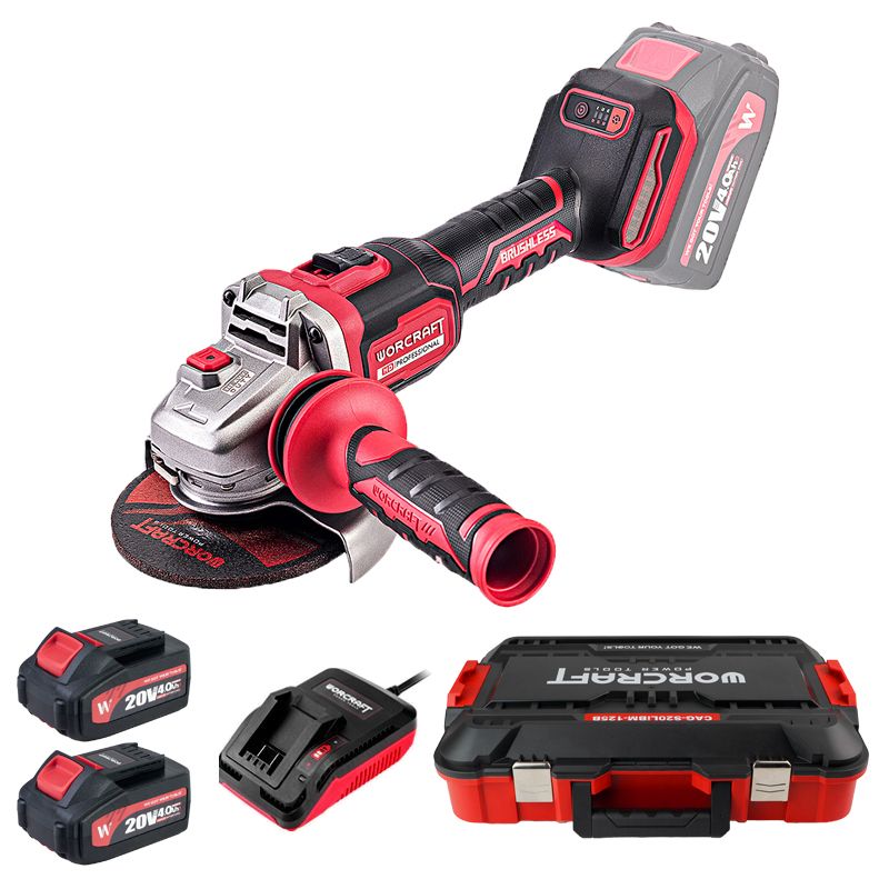 Акумуляторна безщіткова болгарка WORCRAFT CAG-S20LiBM-125B постачається з двома акумуляторами, зарядним пристроєм і міцним пластиковим кейсом.