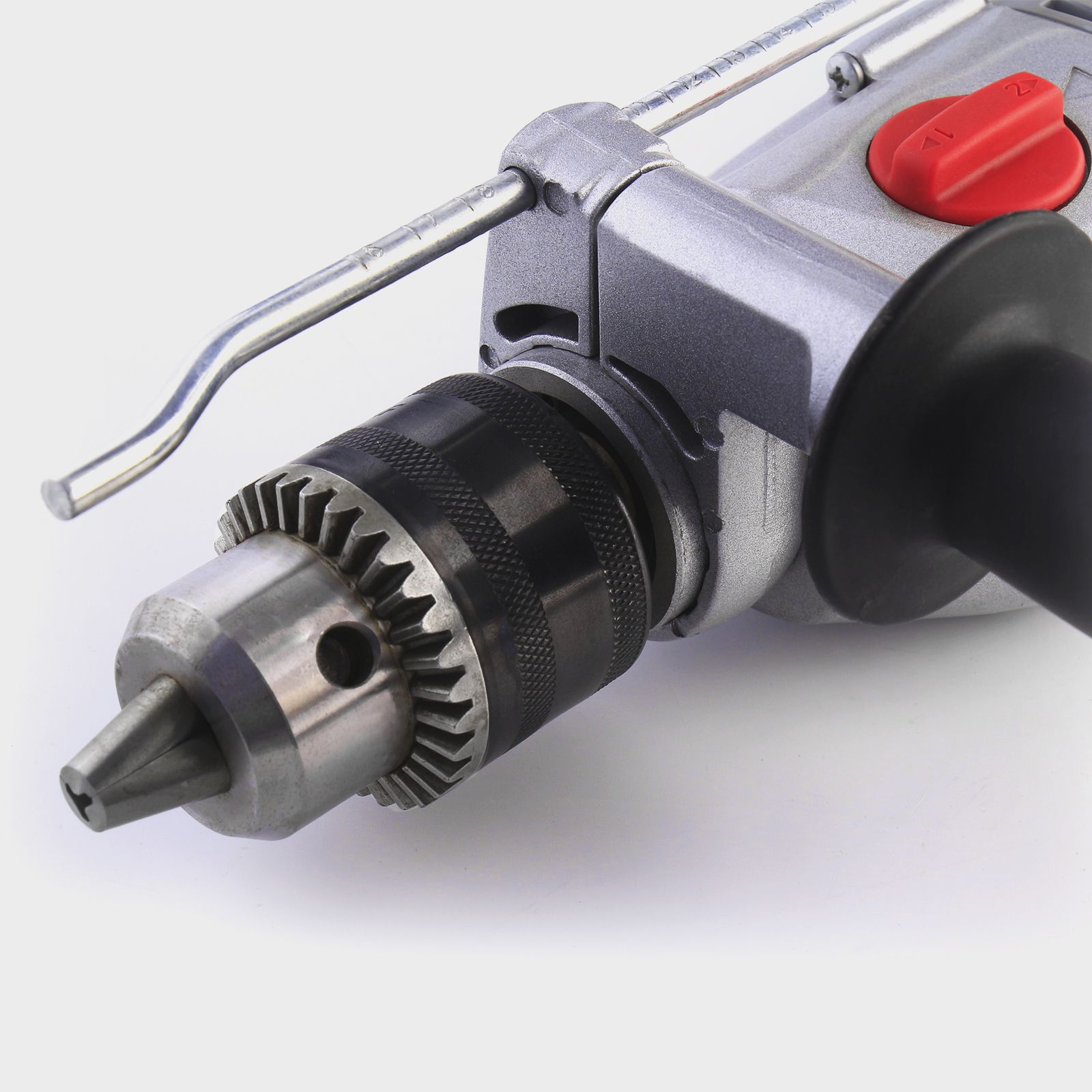 2-х швидкісний редуктор: дає можливість вибрати відповідний діапазон кількості обертів, який дозволяє використовувати оптимальний режим роботи з різними матеріалами. Ключовий металевий патрон: забезпечує надійне кріплення свердла. Реверс: служить для легкого викручування свердла з матеріалу та вивертання кріплення. Блокування кнопки увімкнення: дана функція значно зменшує стомлюваність користувача при тривалій роботі. Регулятор числа обертів: Вибір числа обертів здійснюється за допомогою регулятора, розташованого на вимикачі. Металевий глибиномір: служить для свердління отворів на задану глибину. Комплектація: додаткова рукоятка, глибиномір, ключ патрона, вугільні щітки (запасний комплект). |