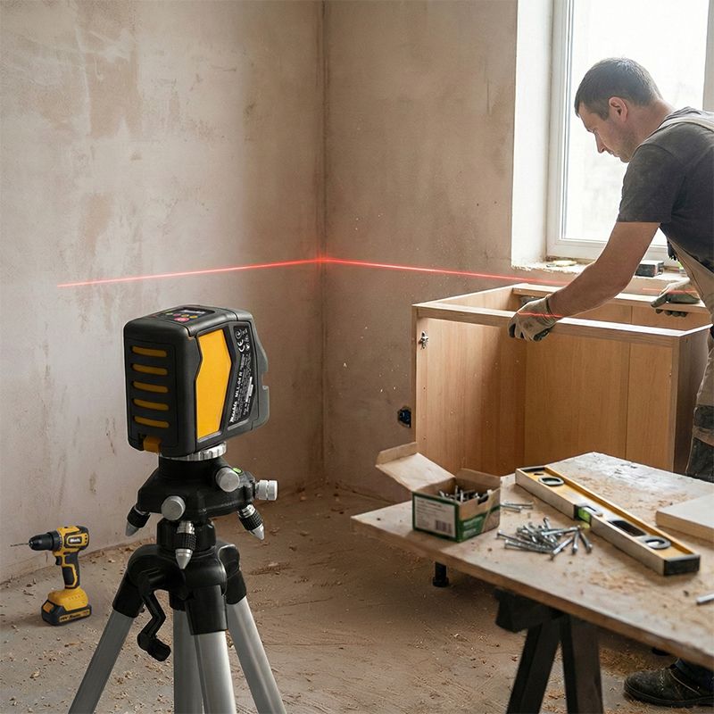 Головна особливість моделі — горизонтальна проєкція на 180°, що дозволяє створювати чіткі лінії одразу на трьох суміжних стінах. Це значно спрощує роботи з розмітки, наприклад, під час укладання стяжки. Пристрій ідеально підходить для монтажу полиць, укладання плитки, поклейки шпалер та інших будівельно-оздоблювальних завдань.