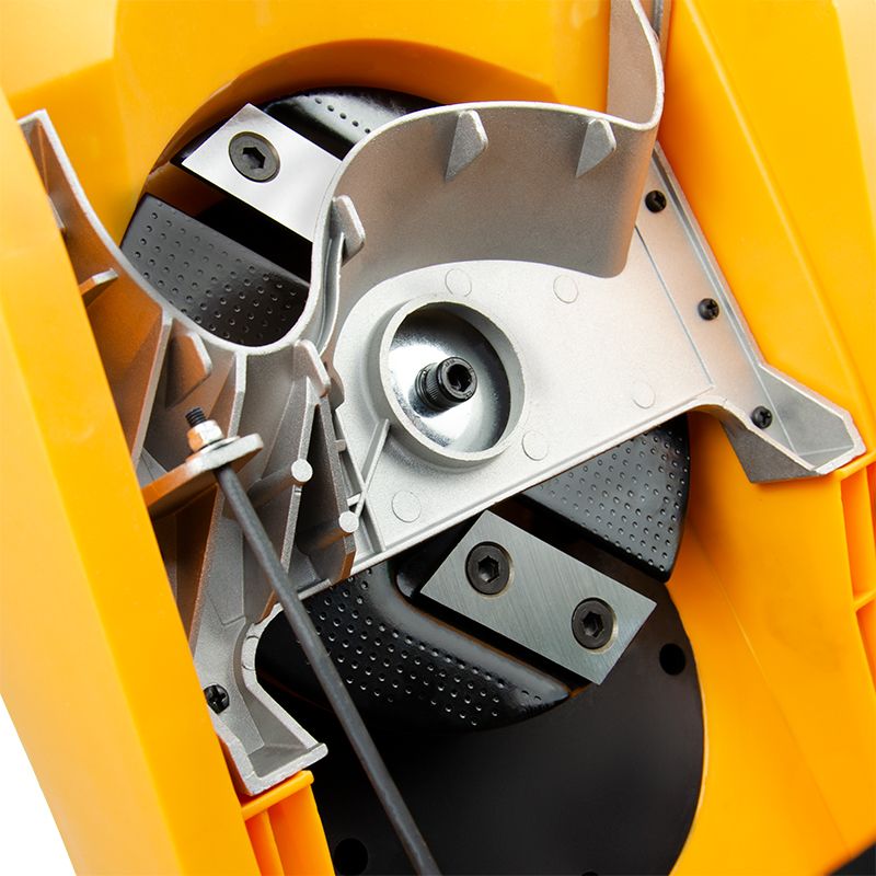 Двосторонні знімні ріжучі ножі забезпечують високу ефективність різання як сирої, так і сухої деревини. За потреби їх можна легко заточити на звичайному заточувальному верстаті.